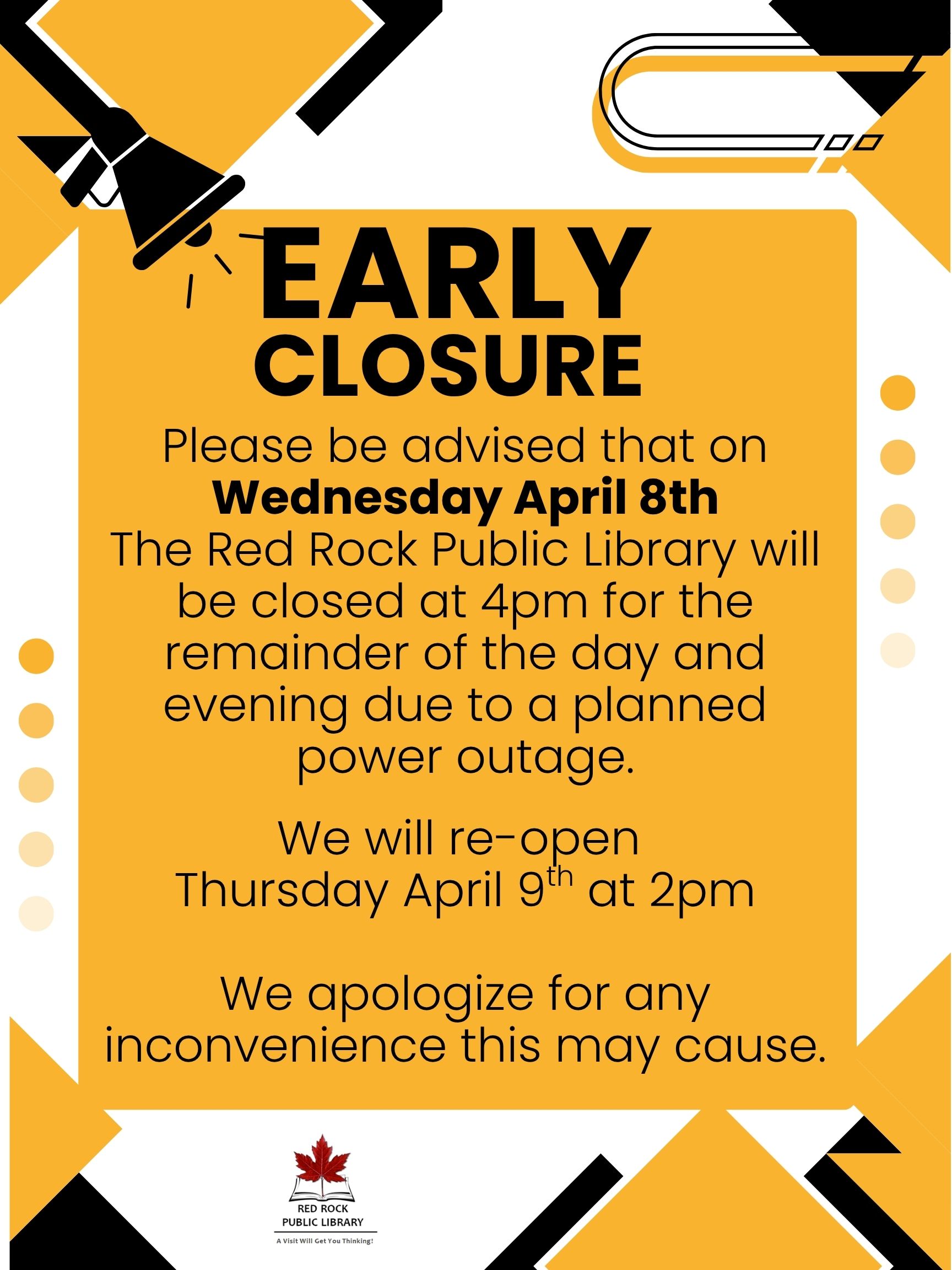 The Red Rock Public Library will be closing at 4pm for the remainder of the day and evening due to a planned power outage.