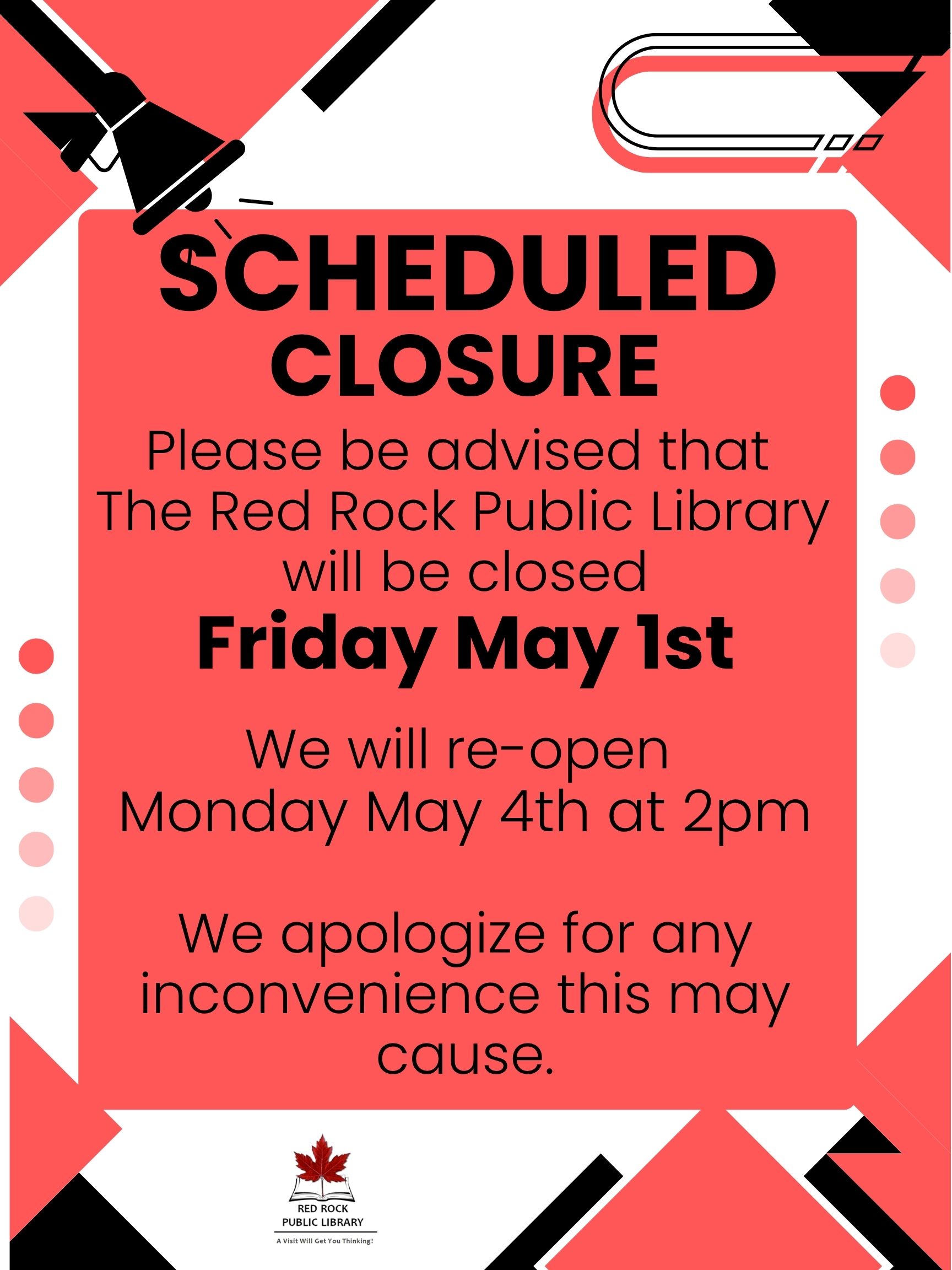 PLEASE NOTE The Red Rock Public Library will be CLOSED Friday May 1st, 2026 We we re-open Monday May 4th under our new operating schedule: Monday- 2-5pm Tuesday & Wednesday- … Continue reading Scheduled Closure →