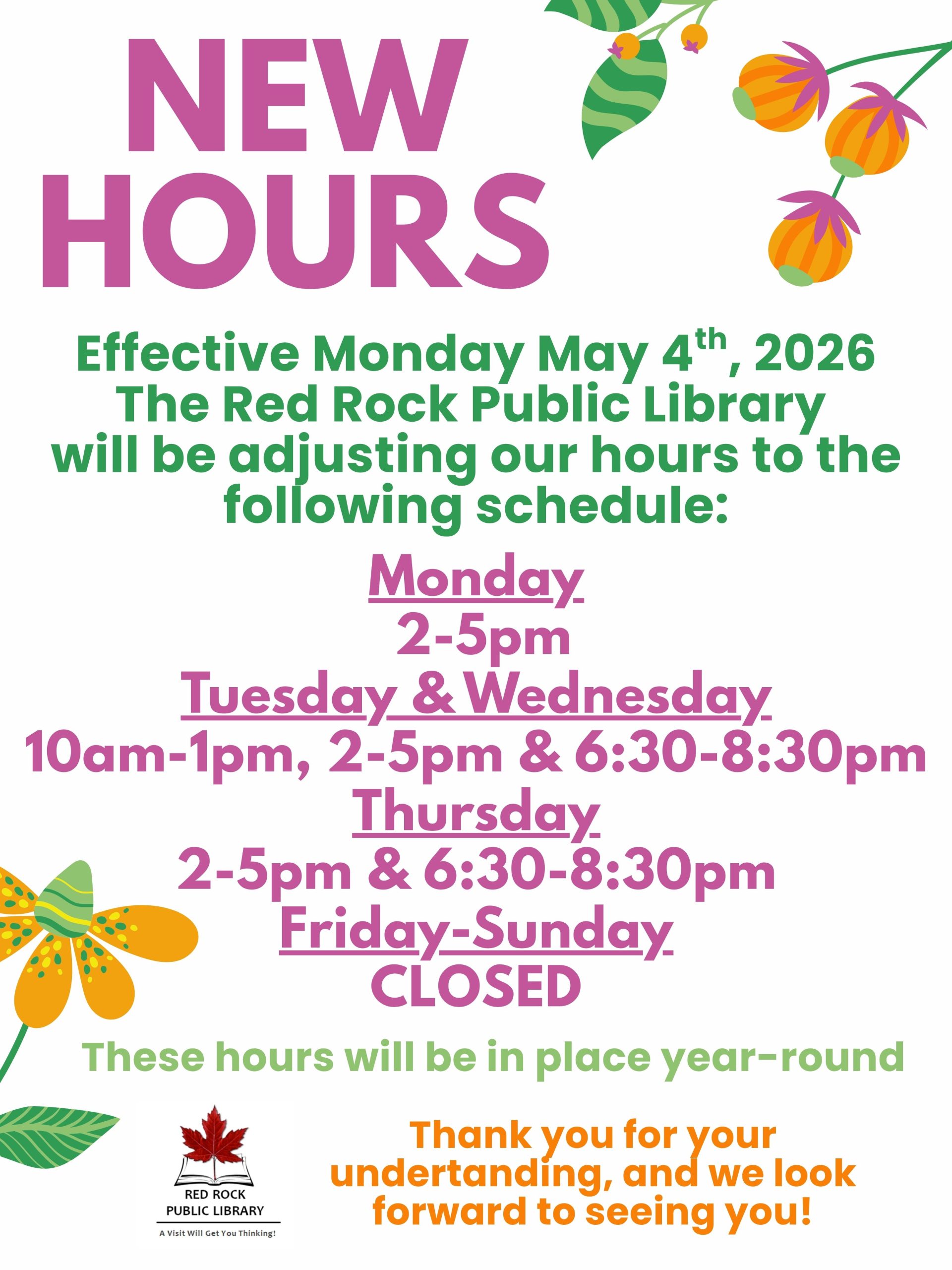 Announcement! As of Monday, May 4, 2026, The Red Rock Public Library will be changing our hours to the following schedule: Monday- 2-5pm Tuesday & Wednesday- 10am-1pm, 2-5pm & 6:30-8:30pm … Continue reading Operating Schedule Change →